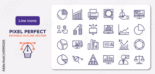business and analytics outline icons set. thin line icons such as graph pie, debt, connected data, circular chart, analytic visualization, hierarchy, businessman analysis, legal vector.