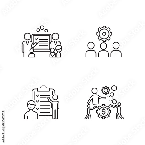 Business and collaboration icon set depicting teamwork, planning, and financial strategy in silhouette