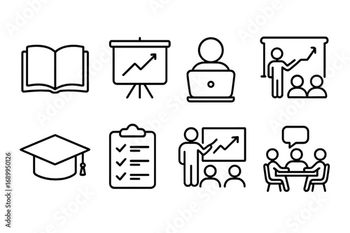 Business and education linear icon set. Vector collection for learning, presentation, meeting concepts. Includes graduation, training, seminar, and growth chart symbols. Outline pictogram.