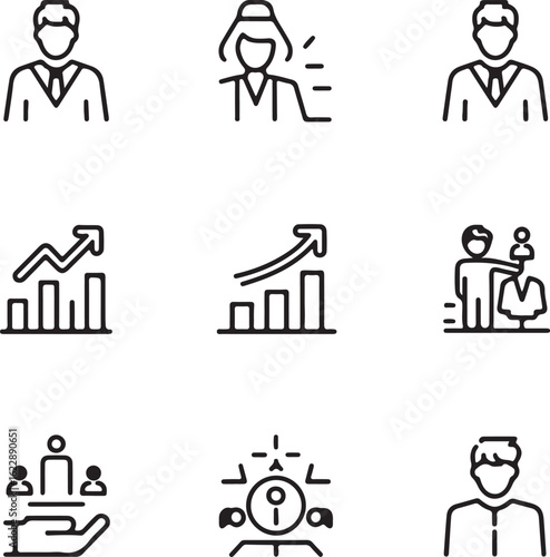 Business and Management Icon Set in Outline Style Representing Leadership Growth Teamwork and Strategic Planning Perfect for Corporate Presentations and Website Design Minimalist and Professional