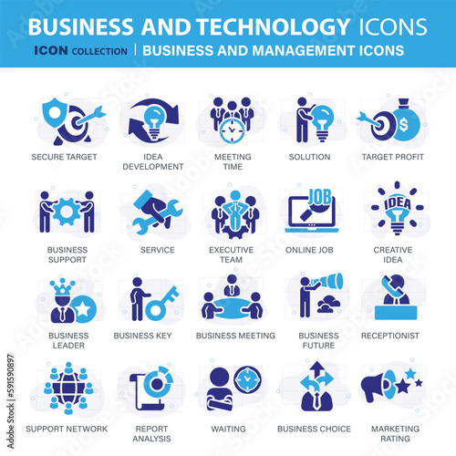 Business and marketing, management, find job, meeting, teamwork collection. Set of blue icons set. Flat vector illustration