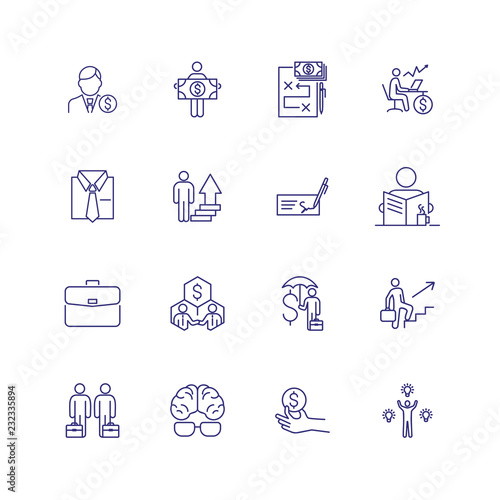 Business and office job icons. Set of line icons on white background. Brains, money, employee, job. Working and business concept. Vector illustration can be used for topics like business, office, job