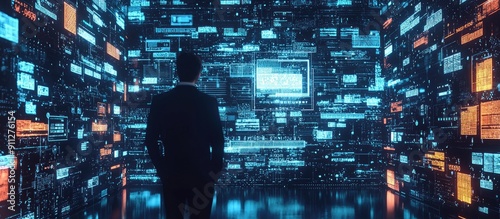 Business and technology concept showcasing a tag cloud related to information systems presented by an IT consultant 3D illustration