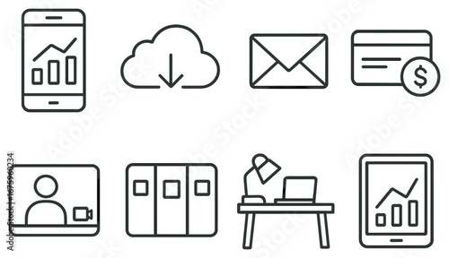 Business and technology linear icon set. featuring phone, download, email, payment, video, files, desk symbols