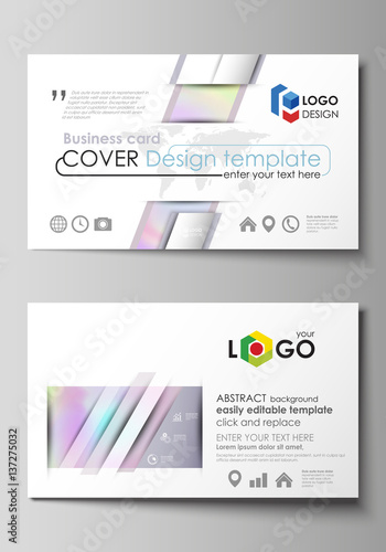 Business card templates. Easy editable layout, abstract vector design template. Hologram, background in pastel colors with holographic effect. Blurred colorful pattern, futuristic surreal texture.