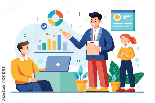 Business coach presents statistics and growth data to executives during a dynamic workshop in a modern office setting