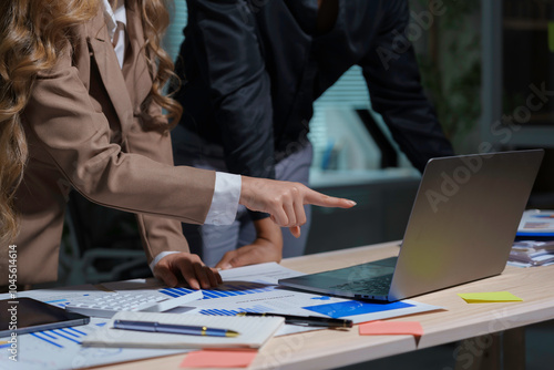 Business colleagues having a discussion and analyzing financial charts while pointing at laptop screen in the office