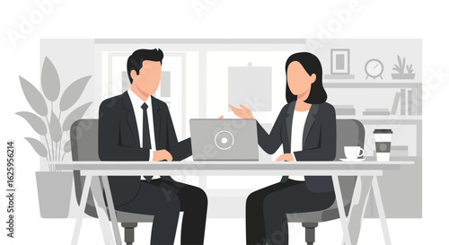 Business colleagues in a meeting discussing a project on a laptop. Man and woman professionals collaborating in a modern office.