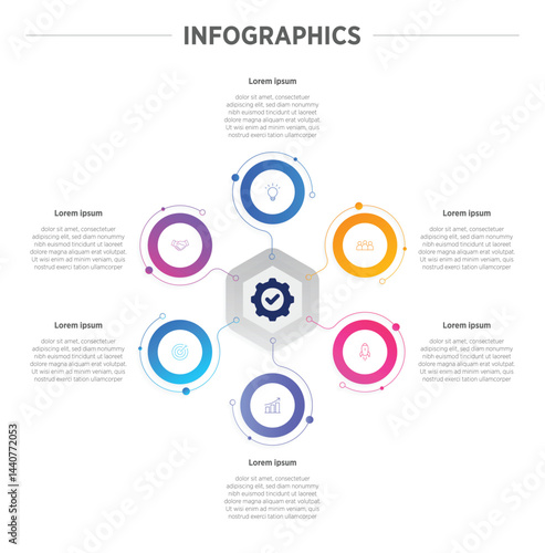 Business Colorful Infographics template. 6 steps rounded timeline with options and marketing icons .Vector rounded infographic with six circle connected elements. Design can be use for presentation.