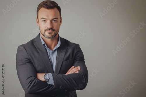 Business concept - portrait handsome business man holding hand with confident face, one color background and copy space with generative ai