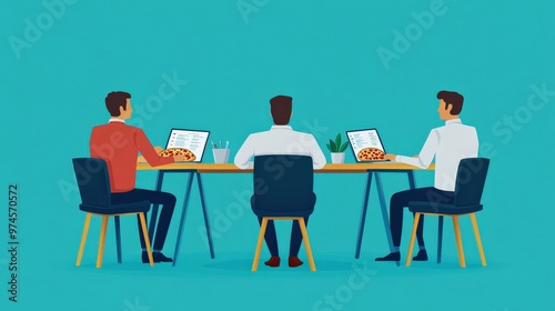 Business concept in minimal of Entrepreneurs enjoying pizza during work meeting, laptops and charts on table, Copy space for stock photo, no text, no logo, flat design illustration