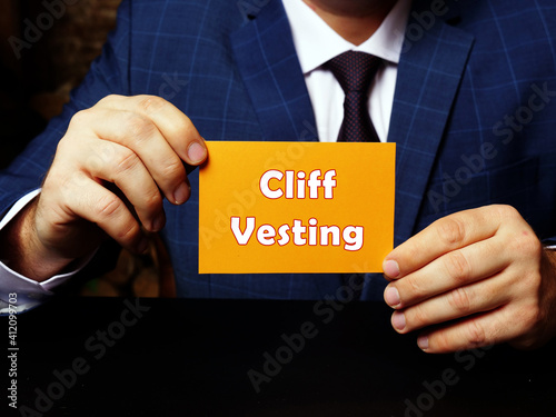 Business concept meaning Cliff Vesting with sign on blank business card.
