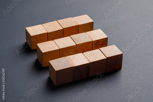 Business concept with wooden cubes on dark grey background high angle view.