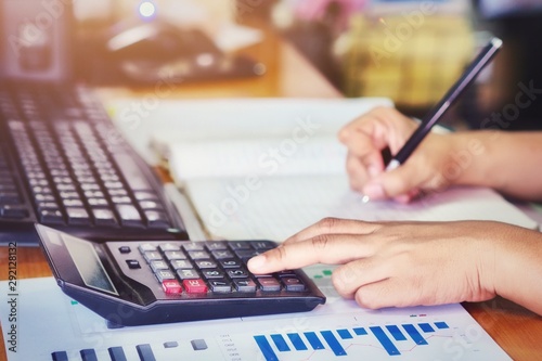 Business concepts, the hands of business women are calculating the company's income. (Focusing only on certain areas , Tone film with Grain and Noise)