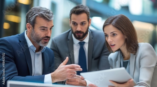 Business consultant, businessman, photos discussing investment planning and market analysis on tablet.