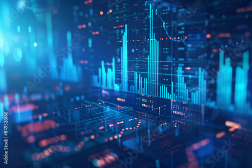 Business data analysis and analytics illustration with charts on blue background. Suitable for marketing, sales, statistics, finance, and corporate strategy purposes.