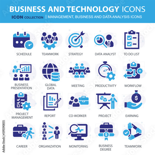 Business, data analysis, organization management and technology icon set. Teamwork, strategy, planning, marketing, cloud technology, data analysis, employee icon set. Icons vector collection