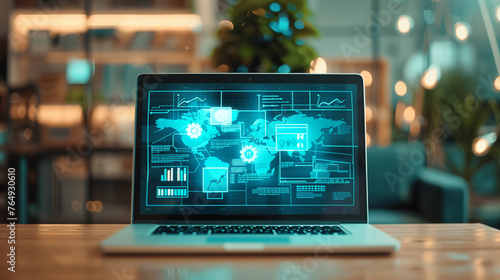 business data statistics analysis display on laptop, data management system software technology, digital data info graphics