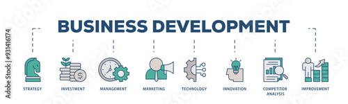 Business development icons process structure web banner illustration of strategy, investment, management, marketing, technology, innovation icon png transparent background.