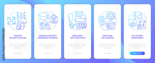 Business digital safety tips blue gradient onboarding mobile app screen. Walkthrough 5 steps graphic instructions with linear concepts. UI, UX, GUI template. Myriad Pro-Bold, Regular fonts used