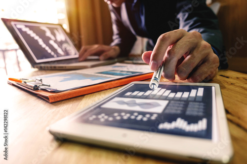 business documents on office desk with laptop and smart phone and graph business diagram and man working in morning light