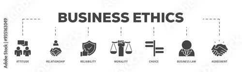 Business ethics icons process structure web banner illustration of attitude, relationship, reliability, morality, choice, business law and agreement icon png transparent background.