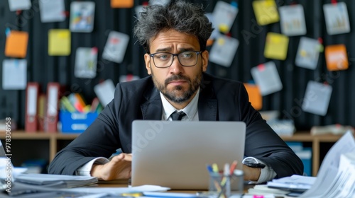 Business executive with a tense expression, working on a laptop surrounded by urgent paperwork and a cluttered desk, showcasing the strain of deadline pressure and overwork