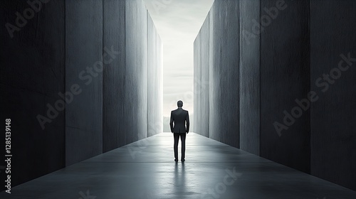 Business Figure Standing in a Concrete Corridor Gazing Towards a Brightly Lit Exit : Generative AI