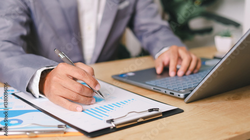 Business Finance, accounting, contract, advisor investment consulting marketing plan. An analyst uses a computer and dashboard for data business analysis and Data Management System.