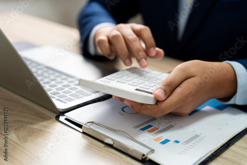 Business finance and budget management, Businessman using calculator and analyzing invoices and tax documents to manage company finances, Budget, Monthly expenses on desk with documents and reports.