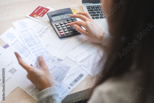 Business financial concept, owe asian young woman sitting stressed, hand calculate expense, cost or budget on table at home from invoice or bill have no money to pay mortgage or loan, debt bankruptcy.