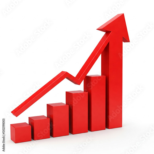 business graph with red arrow. Red upward arrow graph showing rising trend on white background.