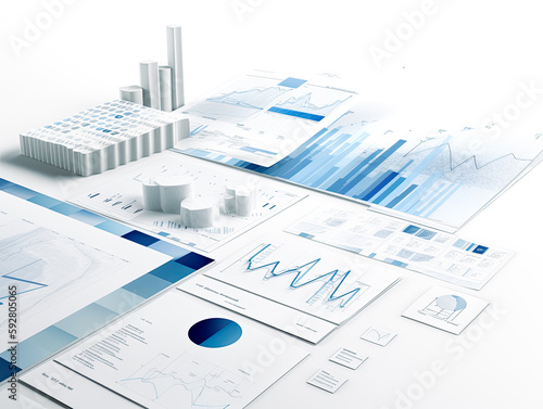 Business graphs and charts, indigo and light azure, white background, architecture. Generative AI.
