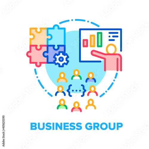Business Group Vector Icon Concept. Managing Company Workers Group And Team Work, Employee Financial Profit Report On Meeting Or Sales Planning. Human Resources And Cooperation Color Illustration