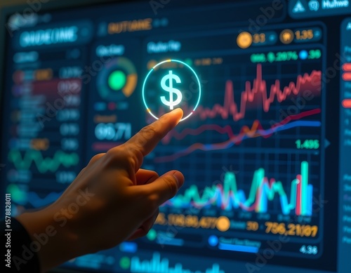 business hand, pressing floating dollar icon labeled “ai finance”, automation in budgeting, neon grid ui, front blur