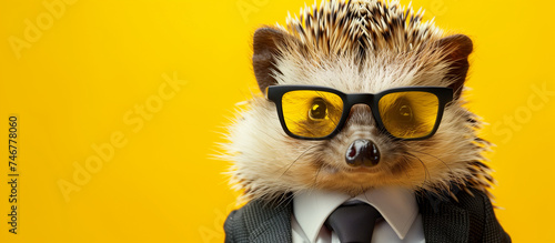 Business Hedgehog Wearing Glasses and Tie on Yellow Background