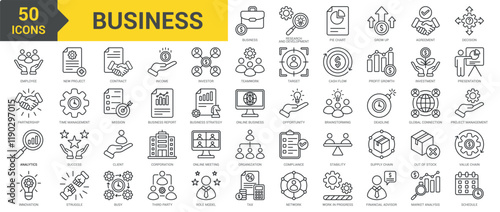 Business icon collection set. Containing research and development, pie chart, agreement, decision, analytics, innovation, employee, project management, presentation, analysis icon. Simple line vector
