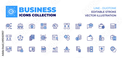 Business icons collection. Line icons, doutone style, editable stroke, vector illustration. business intelligence, critical thinking, consultant, business, swap, team, calculator, briefcase, safebox.