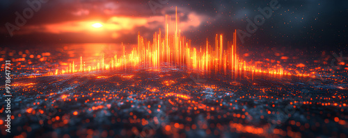 Business impact, holographic price reduction, futuristic financial crisis, neon tech design