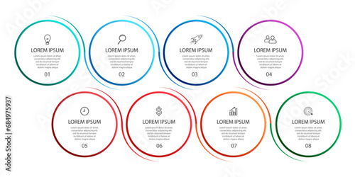 Business Infographic Design Template. minimal Timeline design with 8 steps, options and marketing icons. used as a system flow diagram, your business presentation