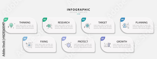 Business infographic template. 7 Step timeline journey. Process diagram, 7 options on white background, Infograph elements, technology, education, modern vector illustration.