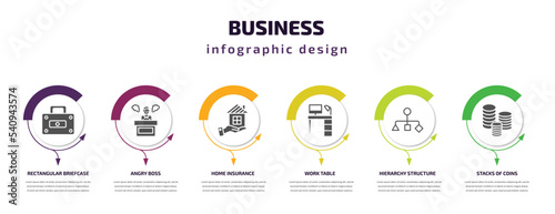 business infographic template with icons and 6 step or option. business icons such as rectangular briefcase, angry boss, home insurance, work table, hierarchy structure, stacks of coins vector. can