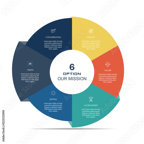 Business infographics. Chart with 6 steps, labels, options, circles. Vector infographic elements, circle chart