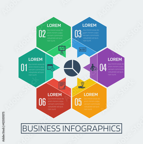Business infographics template with 6 colorful hexagon with mono color icon set and pie chart in the center
