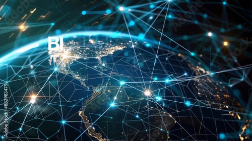 Business Intelligence Data Warehousing A detailed digital depiction of Earth featuring luminous nodes and connecting lines across continents