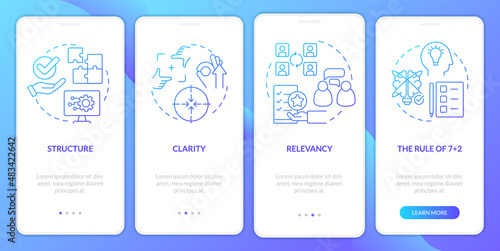 Business interaction basics blue gradient onboarding mobile app screen. Walkthrough 4 steps graphic instructions pages with linear concepts. UI, UX, GUI template. Myriad Pro-Bold, Regular fonts used