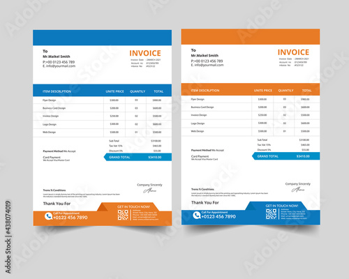 Business invoice form template. Invoicing quotes, money bills or price invoices and payment agreement design templates.