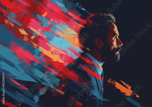 Business Leader Driving Progress with Determination and Vision, Abstract Illustration of Man Running Toward Success, Vibrant Arrows Representing Forward Momentum, Leadership Concept