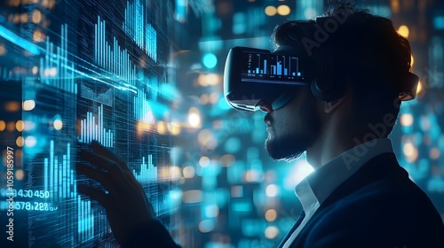 Business Leader Exploring Futuristic Financial Data in Virtual Reality Environment