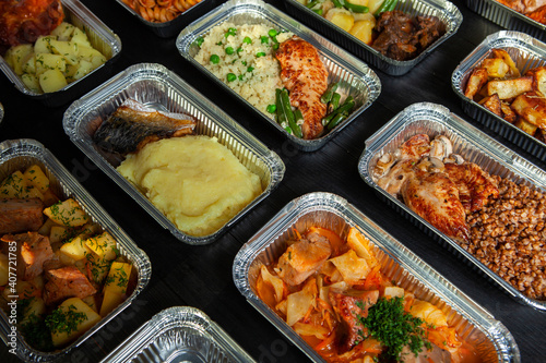 Business lunch in eco plastic container ready for delivery.Top view. Office Lunch boxes with food ready to go. Food takes away. Catering, brakfast.